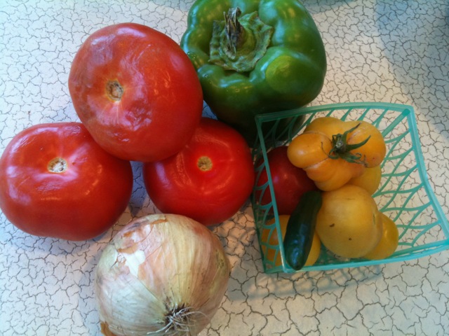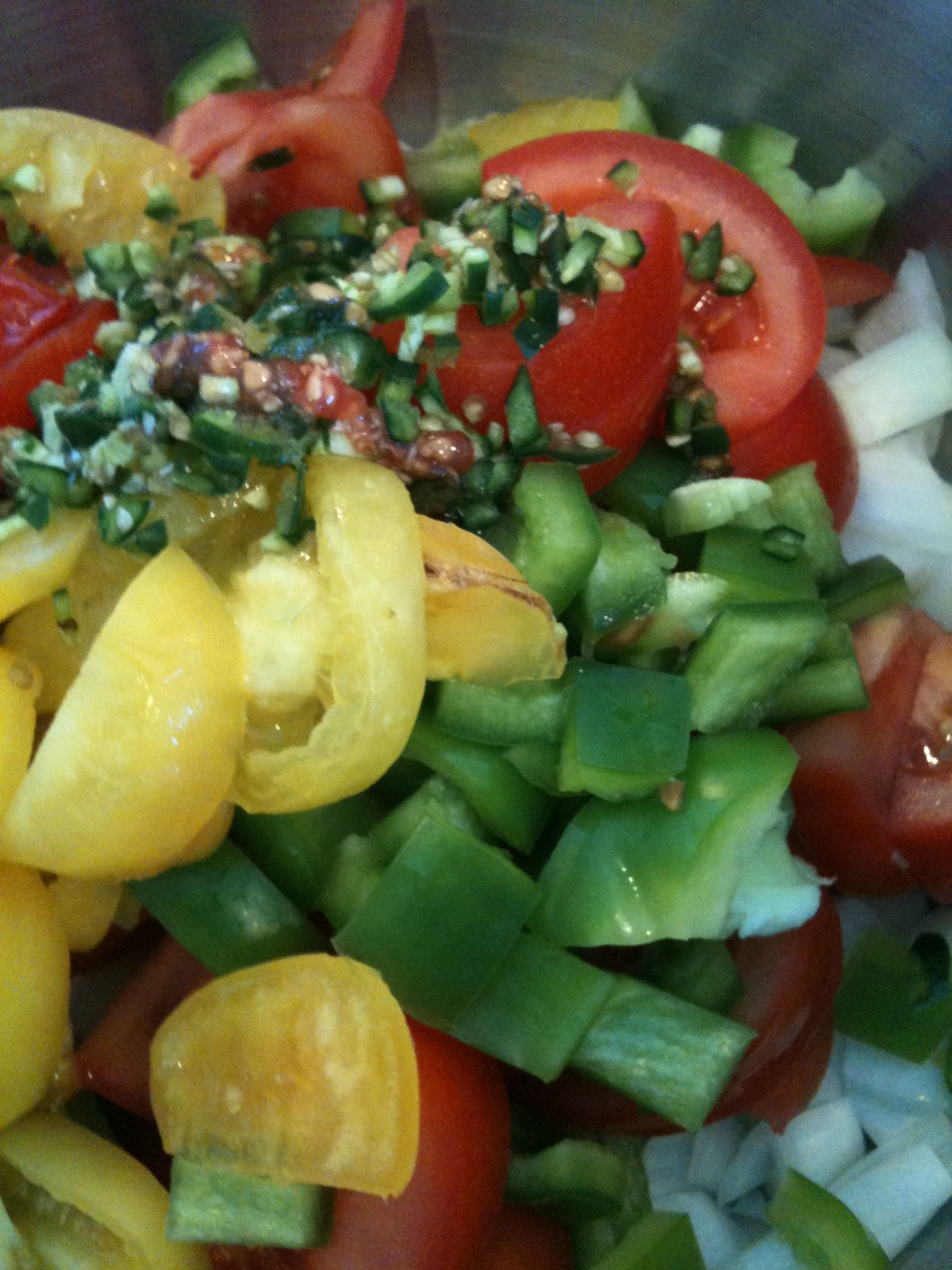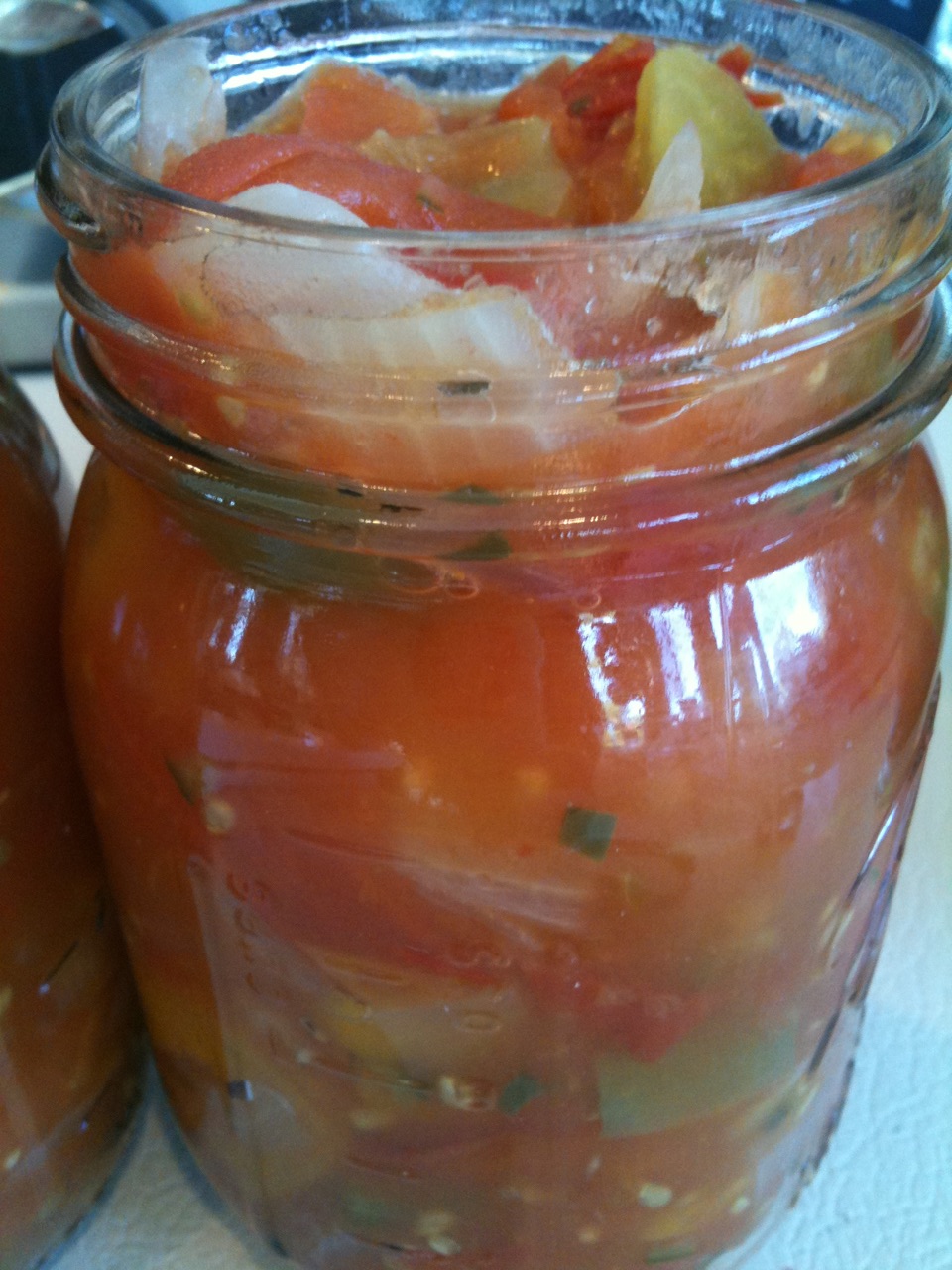 The recipe card above is the actual one, she typed it up on a non-electric typewriter. She did that to quite a few recipes back then, but my favorite are the hand written ones. Now, I did not have 8 quarts of tomatoes on hand, nor did I have the right peppers, so I altered (gasp!) the recipe. Yes, I altered a classic! It turned out very good , too!