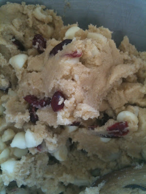 Cream butter and sugars in mixer. Add vanilla and banana. Mix well.Combine flour salt and baking soda in separate bowl and then add to creamed mixture. Mix until combined. Add nuts, cranberries and white chocolate chips and mix together by hand with wooden spoon.