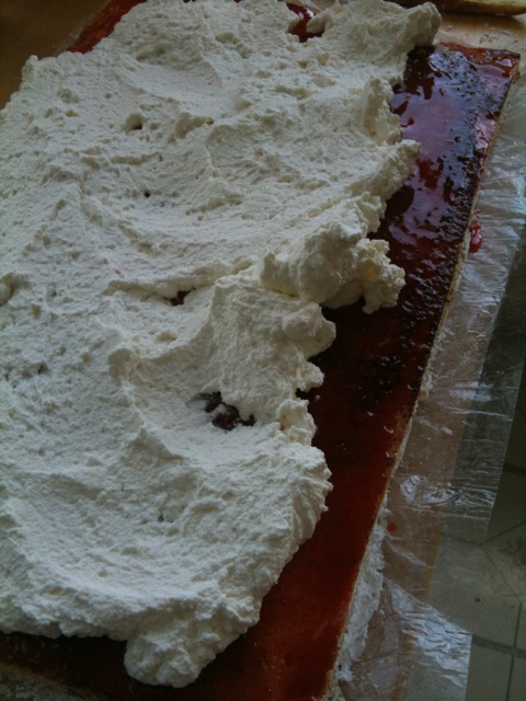 4.MAKE THE FILLING: In a large bowl, whip the cream with the granulated sugar, vanilla and salt to stiff peaks. Using an offset metal spatula, spread the strawberry jam on the cake. Spread the whipped cream evenly over the jam. Begin rolling up the cake from the long side, as tightly as possible, using the kitchen towel and plastic wrap to help shape the roll. Wrap the roll tightly in the plastic and transfer to a baking sheet. Refrigerate for at least 6 hours or, preferably, overnight.