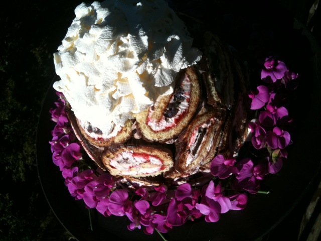 In the center of the Swiss roll I used a slice of almond cake (I had baked previously) covered in the Swiss rolls chocolate glaze, it added a nice flavor and pretty purple color in the middle.