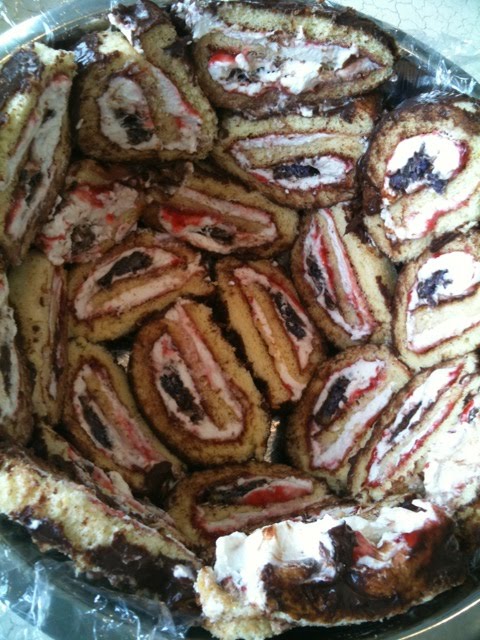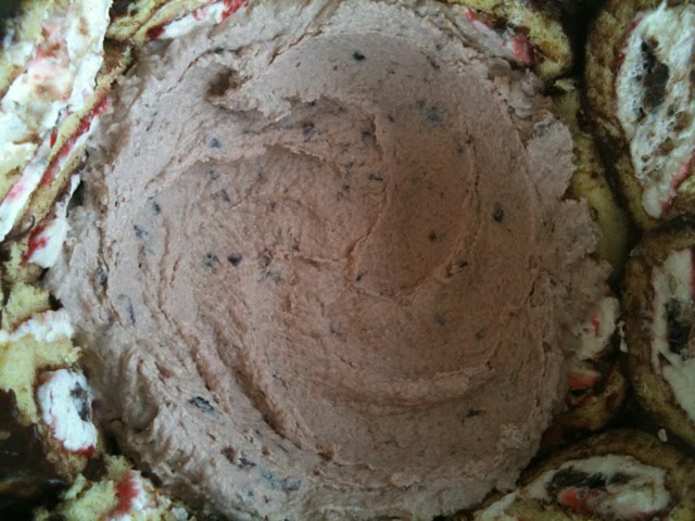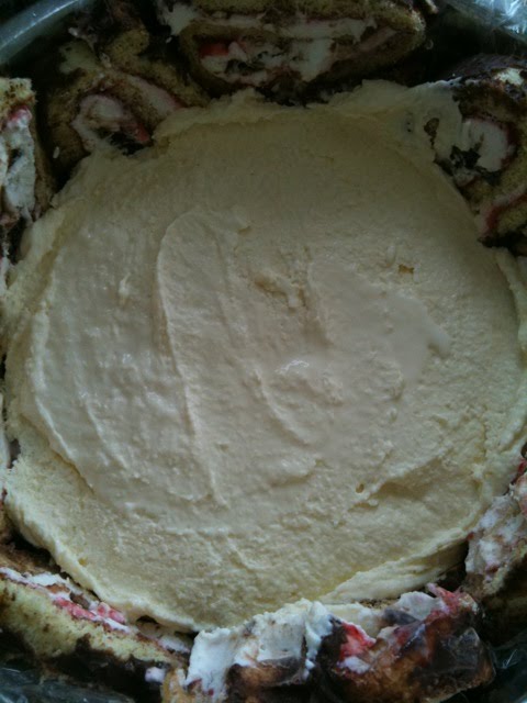 I lined a bowl with plastic wrap and placed the sliced Swiss roll all around it. Then filled with the first batch of softened cherry ice cream and put back in the freezer til it hardened again. This recipe took a total of 3 days to finish with all the recipes and freezing involved.