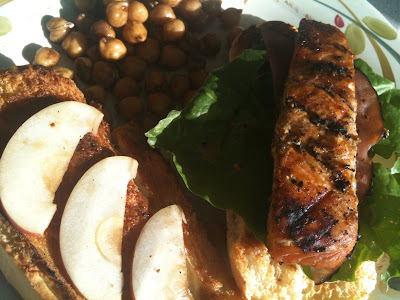 Split the rolls, butter and toast them on the grill for 1-2 minutes. Spread remaining glaze on the rolls and top with warmed ham. Place a leaf of chard on the ham and top with the salmon and 3 slices of apple.
