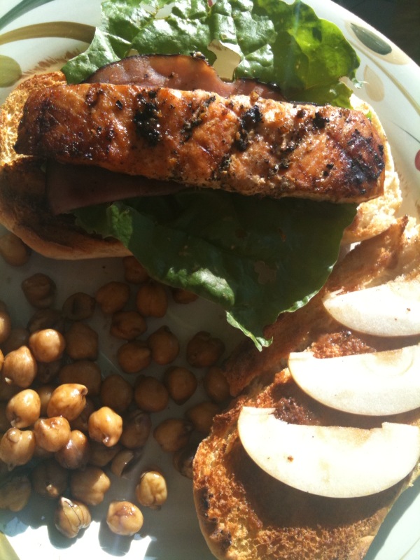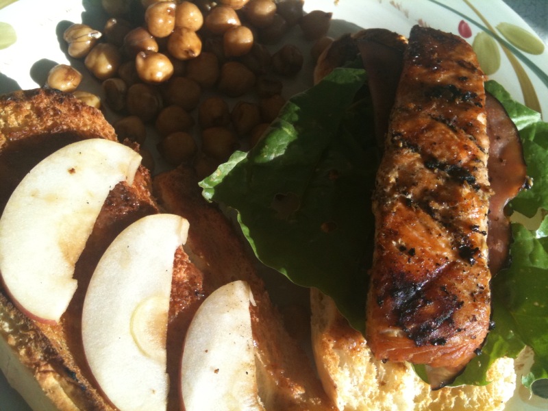 Split the rolls, butter and toast them on the grill for 1-2 minutes. Spread remaining glaze on the rolls and top with warmed ham. Place a leaf of chard on the ham and top with the salmon and 3 slices of apple.